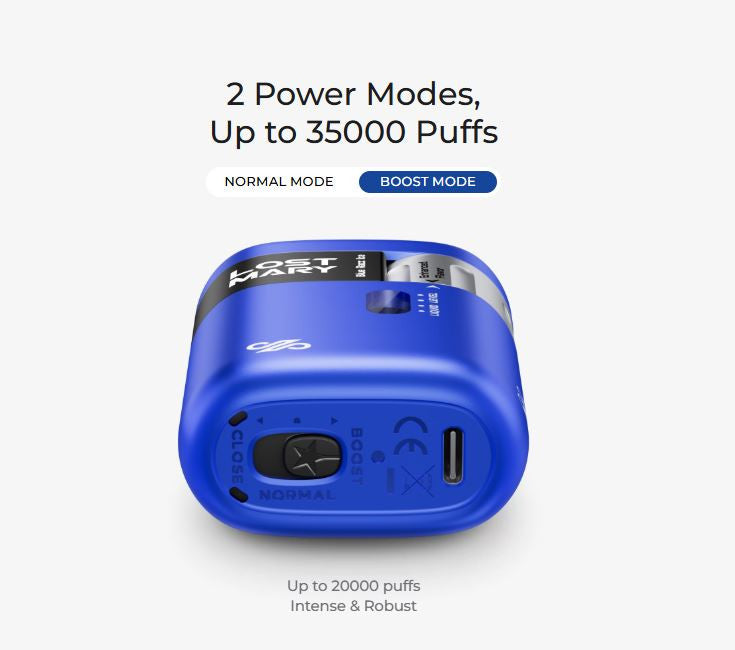 • Puff Count: Approximately 35,000 puffs in Normal mode; about 20,000 puffs in Boost mode