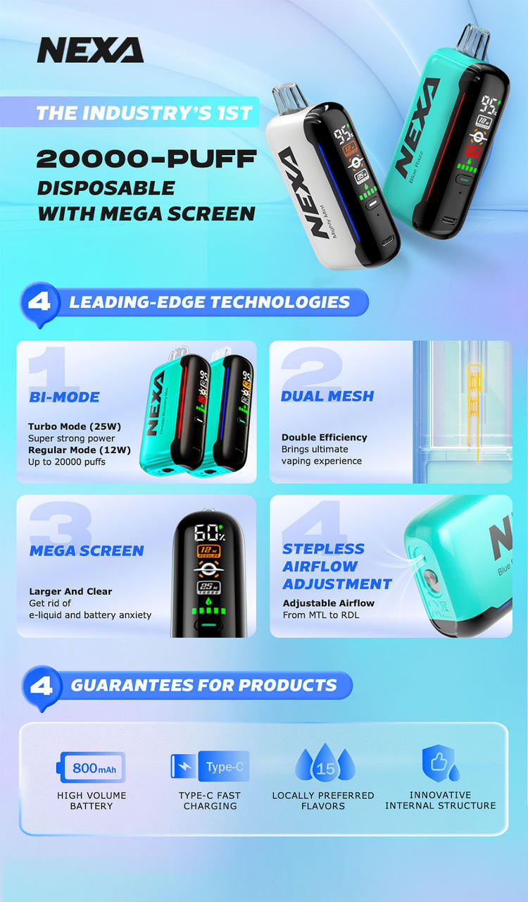 The NEXA N20000 is well-suited for vapers who want a high-capacity, out-of-the-box vaping solution that requires minimal maintenance. It’s ideal for those who value longevity, flavor fidelity through dual mesh coils, and the ability to tailor the draw through adjustable airflow. Whether you’re new to vaping and seeking a simple, reliable device, or an experienced vaper who wants a long-lasting option for travel or daily use, this device offers a compelling balance of power, capacity, and ease of use.